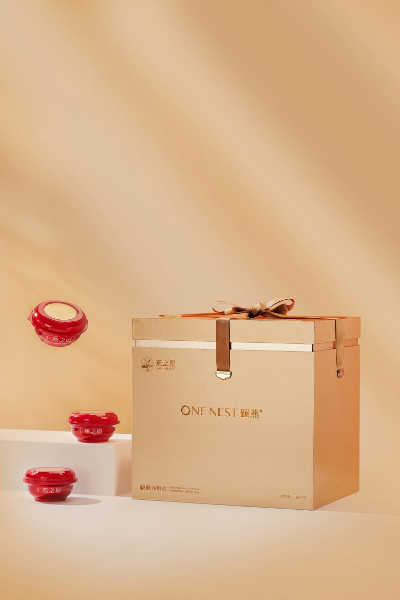 碗燕·濃鮮款為高品質(zhì)生活而匠心打造,盛器與禮盒設計亦不失高貴,儀式感滿滿。禮盒采用尊貴典雅的香檳金色調(diào),給人眼前一亮的高級感。盒蓋選用燕之屋LOGO中的花瓣型進行延展,簡約耐看,寄予“綻放”的美好寓意。禮盒內(nèi)紅金搭配的精巧小碗同樣蘊藏巧思,碗蓋以鉆石型設計,與燕窩的珍貴滋養(yǎng)相契合,別具一格。碗蓋一側(cè)設計手捏“小耳朵”,開蓋不卡頓,指尖不費力,還你優(yōu)雅好姿態(tài)。碗內(nèi)更有一層金屬易撕膜,可減少碗內(nèi)間隙空間,更好保護燕窩條狀,而且輕撕超順滑,燕窩不易撒漏,滋養(yǎng)不再浪費。此外,為滿足不同滋養(yǎng)需求,碗燕·濃鮮款特別設計兩款禮盒裝,樣樣精致。碗燕·濃鮮款(30碗裝)禮盒以層疊擺放,不占用過多空間,綁帶設計可輕松拿取。碗燕·濃鮮款(10碗裝)以上下層抽屜式設計,拿取產(chǎn)品不費勁,優(yōu)雅滋養(yǎng),從容自在。