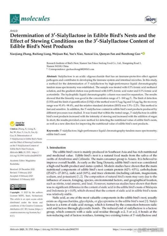 科技創(chuàng)新是產(chǎn)業(yè)發(fā)展的重要源泉和動力。多年來,燕之屋堅持傳承中國滋補(bǔ)文化的同時,結(jié)合現(xiàn)代科研技術(shù)深入研究,充分挖掘燕窩的營養(yǎng)價值及功效?,F(xiàn)代研究發(fā)現(xiàn),“燕窩富含蛋白質(zhì)、氨基酸、唾液酸和無機(jī)元素等,具有抗氧化、改善免疫、抑制血凝、調(diào)節(jié)腸道菌群等功效(來自:白偉娟等.《燕窩成分及功效研究進(jìn)展》,2020)。”在燕之屋燕窩研究院科研團(tuán)隊新近發(fā)布的研究成果中,基于開創(chuàng)性地建立的燕窩中3'-唾液酸乳糖的LC-MS/MS測定方法,及兩年的跟蹤研究發(fā)現(xiàn)3'-唾液酸乳糖作為一種更容易吸收的唾液酸形態(tài),適當(dāng)?shù)臒踔笥兄谘喔C中的唾液酸向更易吸收的3'-唾液酸乳糖的形態(tài)轉(zhuǎn)化。研究表明,“碗燕產(chǎn)品中3'-唾液酸乳糖含量顯著高于家庭燉煮燕窩(100℃ 30min)(來自:國際權(quán)威期刊《Molecules》,Determination of 3'-Sialyllactose in Edible Bird's Nests and the Effect of Stewing Conditions on the 3'-Sialyllactose Content of Edible Bird's Nest Products)。”如燕之屋旗下高端燕窩品牌碗燕飛天款的3'-唾液酸乳糖含量相對于于燉煮燕窩高達(dá)20余倍,表明燕之屋專利燉煮工藝(專利號:ZL201410393800.4 ;專利名稱:一種速食燕窩軟罐頭的制作方法)能夠激發(fā)燕窩的營養(yǎng)活性,提升燕窩產(chǎn)品的營養(yǎng)價值(來自:燕之屋燕窩研究院,碗燕產(chǎn)品五維營養(yǎng)分析報告)。”此外,燕之屋燕窩研究院科研團(tuán)隊一直以來燕之屋始終堅持走“研發(fā)立企、創(chuàng)新興企”之路,基于研究成果不斷對產(chǎn)品進(jìn)行升級和創(chuàng)新,致力于為消費(fèi)者打造更為科學(xué)、營養(yǎng)、健康的產(chǎn)品。截止至2023年8月1日,燕之屋發(fā)表論文共計44篇,其中SCI 11篇。