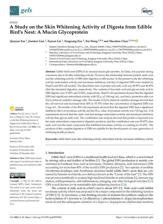燕之屋潛心燕窩肽研究,成立燕之屋燕窩肽研究中心,聚焦燕窩肽酶解技術、活性成分與功能研究等多方向賽道,近年來不斷取得突破,成果斐然。2021年,燕之屋燕窩研究院和江南大學食品科學與技術國家重點實驗室聯(lián)合完成研究成果“A study on the skin whitening activity of digesta from edible bird's nest: A mucin glycoprotein”,發(fā)布于權威學術性期刊《Gels》;2022年,燕之屋燕窩研究院攜手香港科技大學攜手完成燕窩肽抗皮膚炎癥功能研究,專業(yè)研究成果“Edible bird’s nest, an Asian health food supplement, possesses anti-inflammatory responses in restoring the symptoms of atopic dermatitis: An analysis of signaling cascades”發(fā)布于權威學術性期刊《Frontiers in Pharmacology》;2023年,燕之屋燕窩研究院通過體外生化、細胞、生物三維立體證實了燕窩肽的抗衰老功效,并在國際權威期刊《Journal of Functional Foods》發(fā)表了燕窩肽抗衰研究"Study of the antiaging effects of bird's nest peptide based on biochemical, cellular, and animal models",揭示燕窩肽抗衰老功效,再一次為燕窩肽的研究發(fā)展貢獻有利價值。近日,燕之屋“一種具有促進細胞修護、高保濕美白功效的燕窩肽制備方法及應用”獲得國家知識產(chǎn)權局發(fā)明專利授權(專利號:ZL 2022 1 1398048.3),充分證明燕之屋在燕窩肽領域的引領地位。