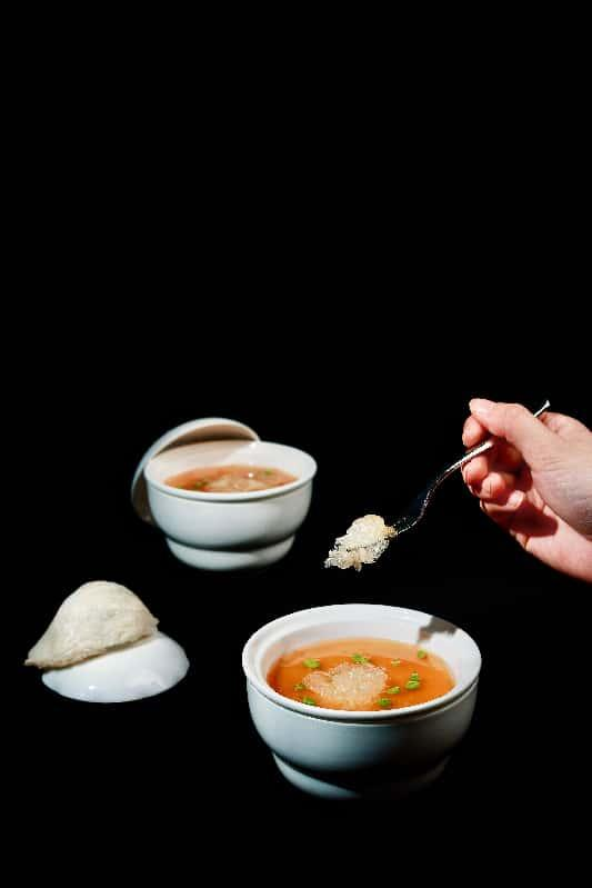 芙蓉糟溜燕菜,升級(jí)傳統(tǒng)“糟溜”手法,同時(shí)融入西式元素,彈潤(rùn)透亮燕窩浸染陳年酒糟的馥郁,與潔白蛋清碰撞出形式芙蓉的絕妙色彩,入口酒香沁脾,燕絲纏綿,帶來(lái)別具一格的舌尖體驗(yàn)。酒糟氣息悠悠升騰,融合在一匙間完成,既保留了“酒香入菜”的傳統(tǒng)精髓,也表達(dá)了現(xiàn)代美學(xué)語(yǔ)境下的“輕盈與克制”。