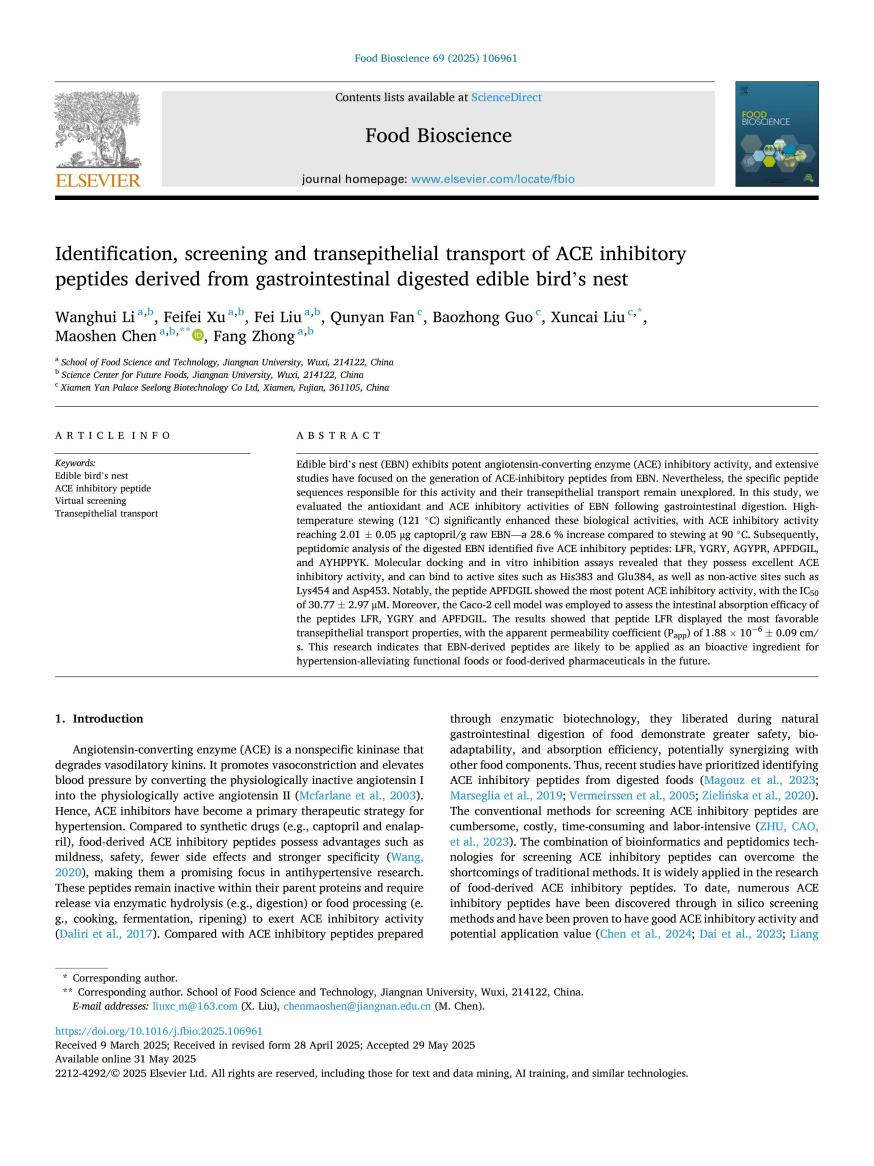 ⑥Identification, screening and transepithelial transport of ACE inhibitory peptides derived from gastrointestinal digested edible bird's nest(燕窩消化后衍生的ACE抑制肽的鑒定、篩選及跨上皮轉運)[J]. Food Bioscience, 2025: 106961.