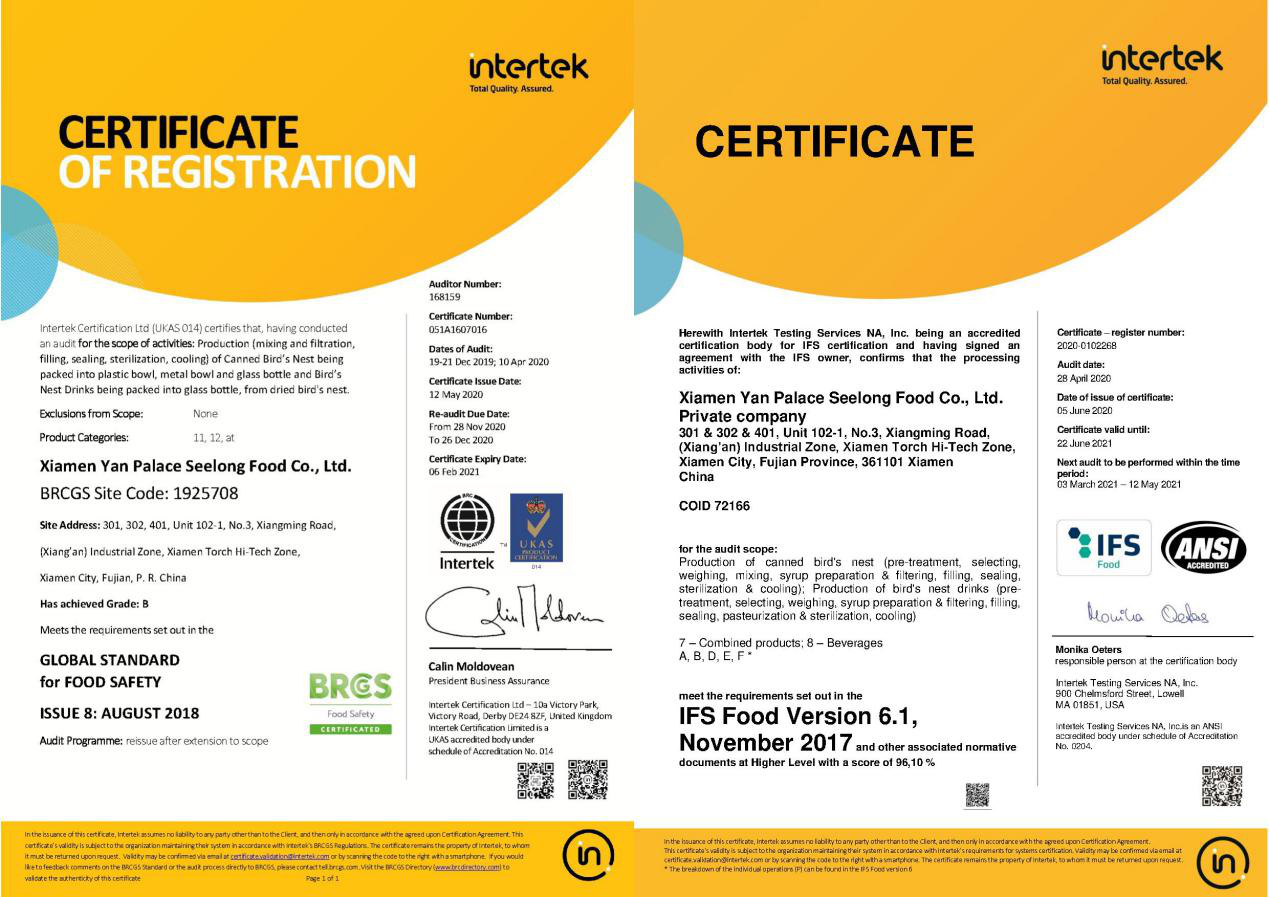 圖:燕之屋通過BRC、IFS雙重認(rèn)證