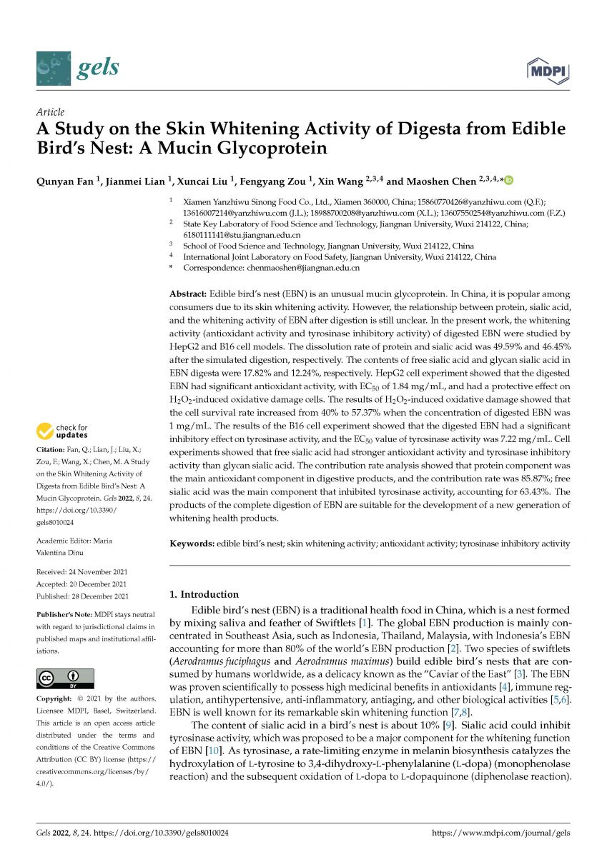 在2021年12月28日,燕之屋燕窩研究院和江南大學食品科學與技術國家重點實驗室攜手完成并刊登了專業(yè)研究成果《食用燕窩消化物的皮膚美白活性研究:一種黏蛋白糖蛋白》,并發(fā)布于權威學術性期刊《gels》。